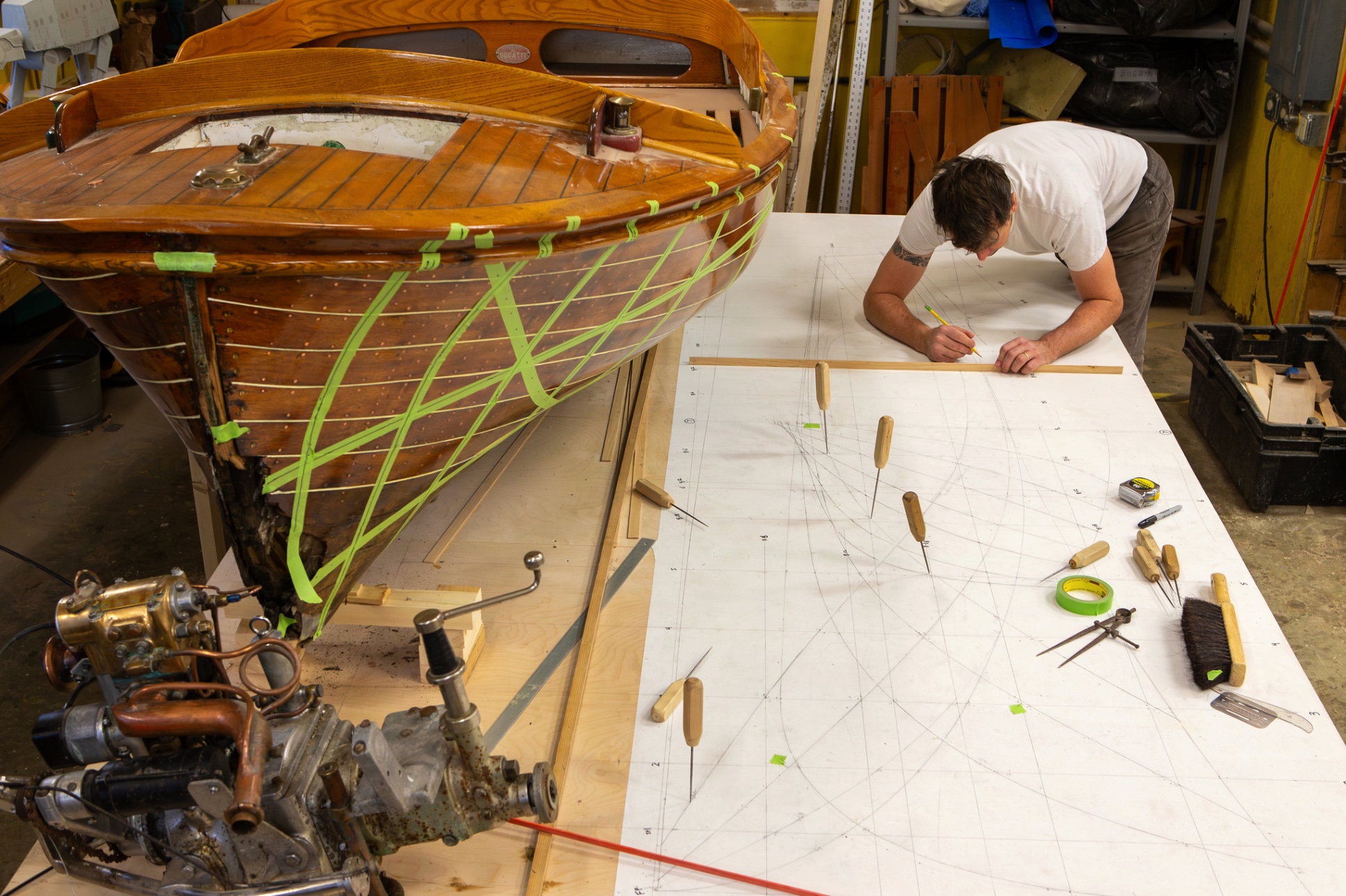 Unfortunately, YOU-YOU did not fare well over many years on ATLANTIDE’s upper deck, and her double-planked copper riveted hull planking and backbone structure were deteriorated beyond repair. Our crew has been enlisted to undertake the complete restoration of this priceless artifact, while her original Bugatti 170 cc single cylinder engine is being restored by Leydon Restorations in Lahaska, PA.