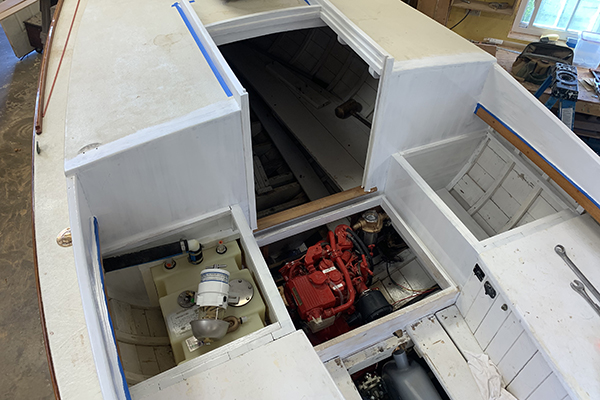 SEA LADY – One of my favorite boats, SEA LADY, was in the shop this spring for an overhaul. 18′ LOA and designed by Aage Nielsen in 1948 as an open cockpit daysailer with a small auxiliary diesel, she was later refitted with a large house and the engine removed. SEA LADY needed a new stern post, and the owner determined that this was an opportune time to reinstall an engine. While discussing the merits of removing the house and going back to the open cockpit arrangement, we conceived a new layout that renders SEA LADY both better looking and more useable. A Beta 14 hp diesel was installed in the position indicated by her original design, and then we moved the later added main bulkhead forward 24″ – literally doubling the size of the cockpit while maintaining the two bunks below deck in the cabin. SEA LADY’s owners can now comfortably daysail with friends and family and extend their cruising range to the islands of Penobscot Bay – regardless of the breeze.
