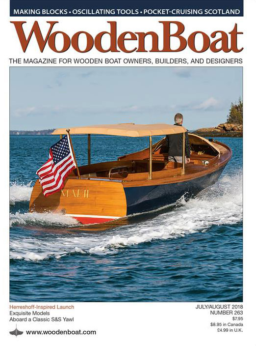 The July/August issue of WoodenBoat features the Herreshoff-inspired yacht tender designed by Matt Smith that we recently built. Photo by Ben Mendlowitz.