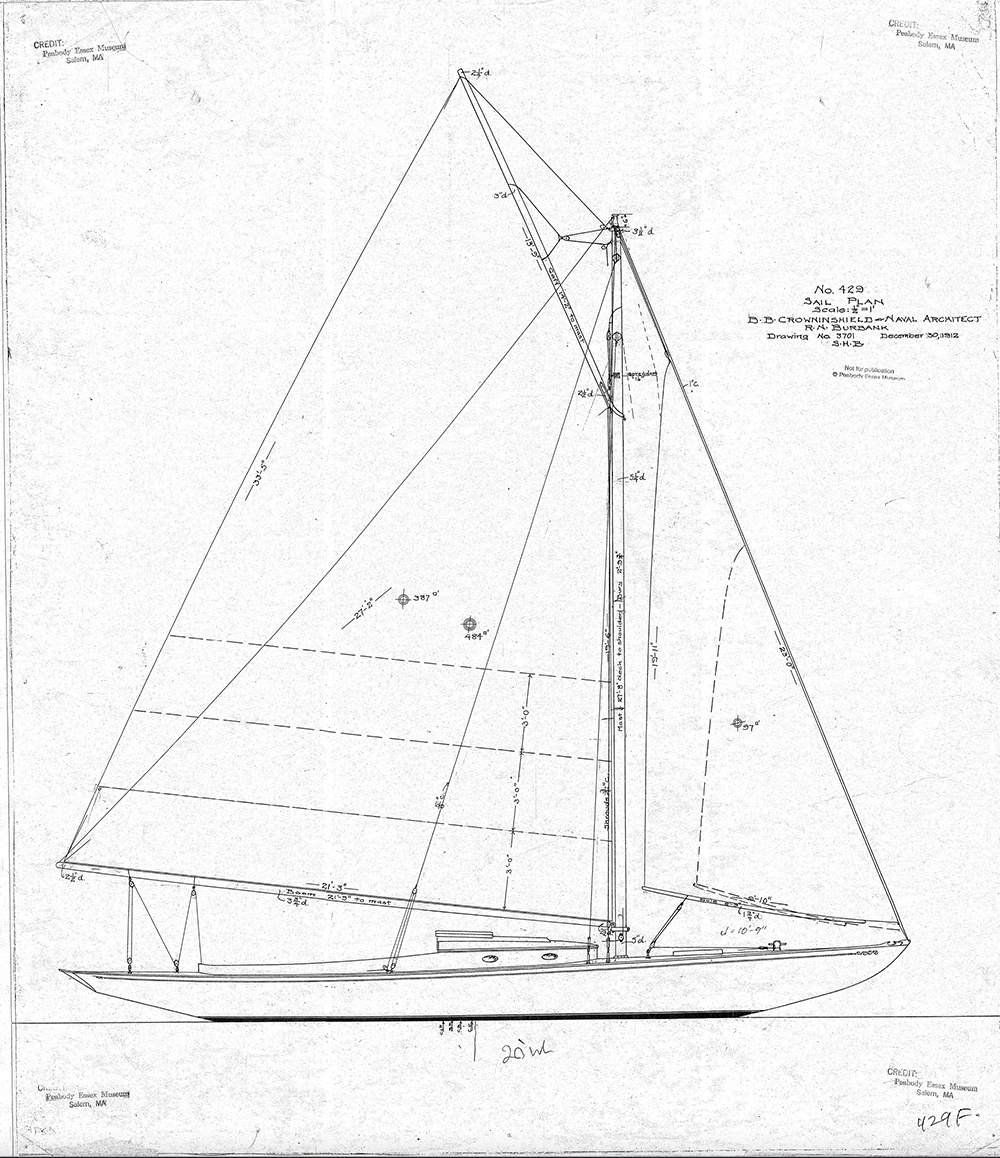 Another project we’re dying to sink our teeth into is building a brand-new Crowninshield 20, design #429 of 1912. This 33′ LOA knockabout is a larger version of the venerable Dark Harbor 17 and Camden Class knockabouts, but with room for a wonderfully comfortable cockpit, a small diesel or electric auxiliary motor, and a cabin that’s large enough for the occasional overnight, or for an afternoon nap. The gaff sail plan is modest and could be easily handled by two. She’d be a great boat for racing in the classic series, and for construction I’d go purely traditional plank-on-frame with bronze fasteners, and I’d loft it by hand on the floor the old-fashioned way.