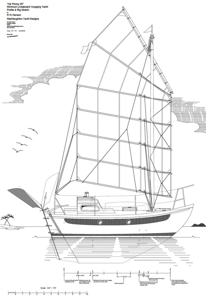 There is no engine, no through-hulls, and the self-steering sail plan is an unstayed junk rig with a carbon fiber mast. Both the hull and deck are cedar strip planked, with 10 ounce unidirectional cloth/epoxy sheathing inside and out. Centerline structure is laminated fir; ballast is external lead; and all mechanical fasteners are bronze. Cruising speed is 4.5 knots, and careful consideration has been given to ample storage of food and water for up to 60 days at sea.
