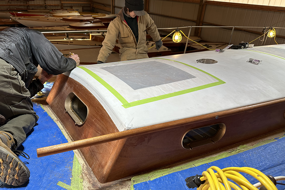 Since the boat had already been given a new deck and toe rails by Benjamin River Marine in the early 2000s, our work began with Jerry and Kale replacing the cockpit footwell and sheathing the cabin sides with ¼”-thick Honduras mahogany veneers. Both areas had deteriorated and been painted. Now they will be varnished again! Sprout replaced the original canvas cabintop sheathing with two layers of 10 oz fiberglass cloth set in epoxy, and constructed new seat tops for the cockpit lockers.
