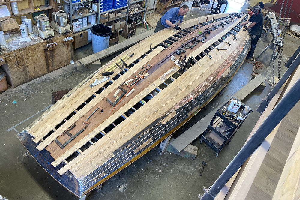 Spring saw the completion of three major projects that were begun in 2021: GRAMPUS, the 26′ open launch, built by J. O. Brown in 1927, was returned to North Haven in July and will be featured in an upcoming article in Maine Boats, Homes, and Harbors magazine. KAZE, the 30′ Clinton Crane-designed IDEM scow sloop, was returned to her home on Upper St. Regis Lake in the Adirondacks a few days later. She immediately started winning races for the first time in many years. GRAMPUS and KAZE have returned this winter for storage and annual maintenance, and KAZE will be getting new cockpit coamings and covering boards.