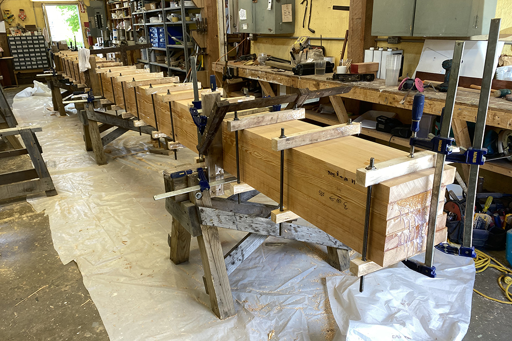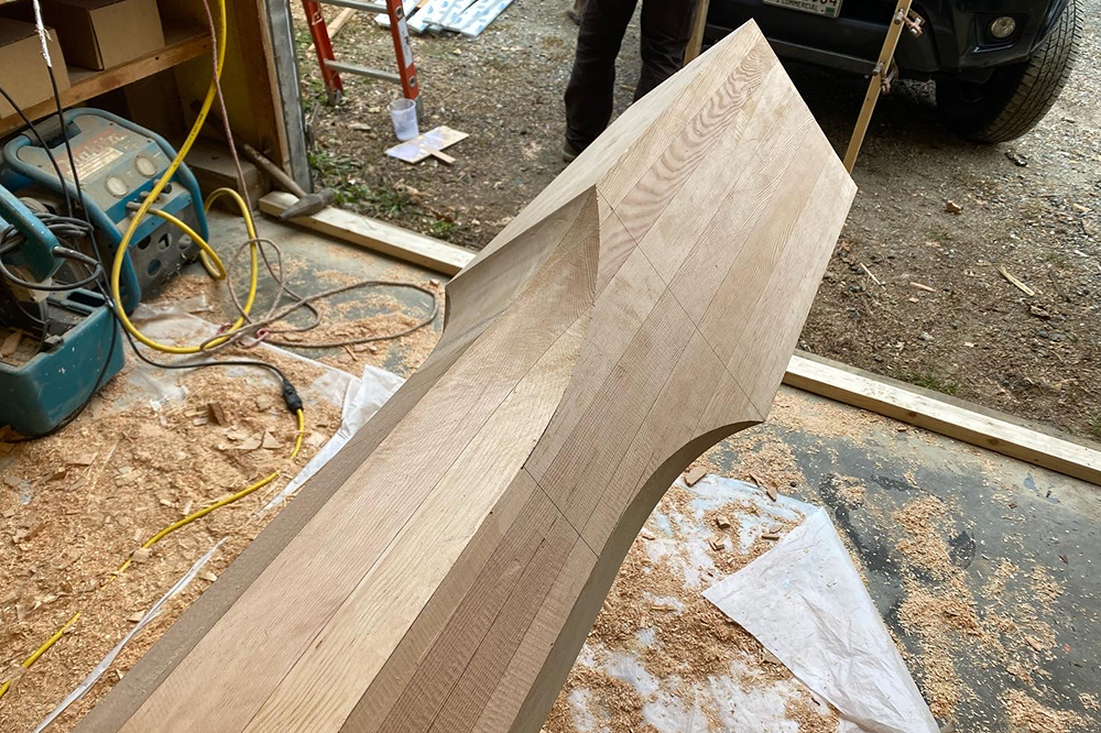 We love building spars, and big solid ones are the best! Our friends down at Bristol Marine at Boothbay Harbor were finishing up the multi-year restoration of the 112′ Gloucester fishing schooner ERNESTINA-MORRISSEY in September and asked if we could build the main and fore topmasts. Each spar was 12″ in diameter and they measured 41′ and 26′ long respectively. Garrett and Jasper built them from laminations of old-growth Douglas-fir and delivered them to Boothbay on October 20, just in time for vessel’s departure for her new home at Massachusetts Maritime Academy.